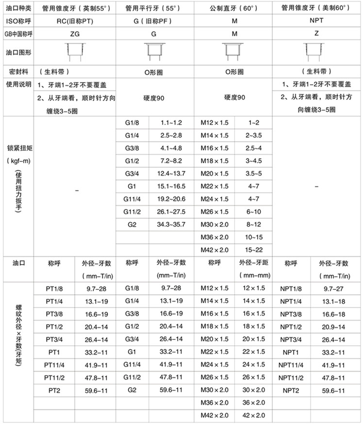 液壓油缸的油口種類、油口尺寸對(duì)照表如下,供您參考: